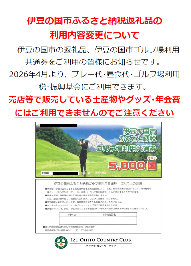 伊豆の国市の返礼品、伊豆の国市ゴルフ場利用共通券をご利用の皆様にお知らせです。