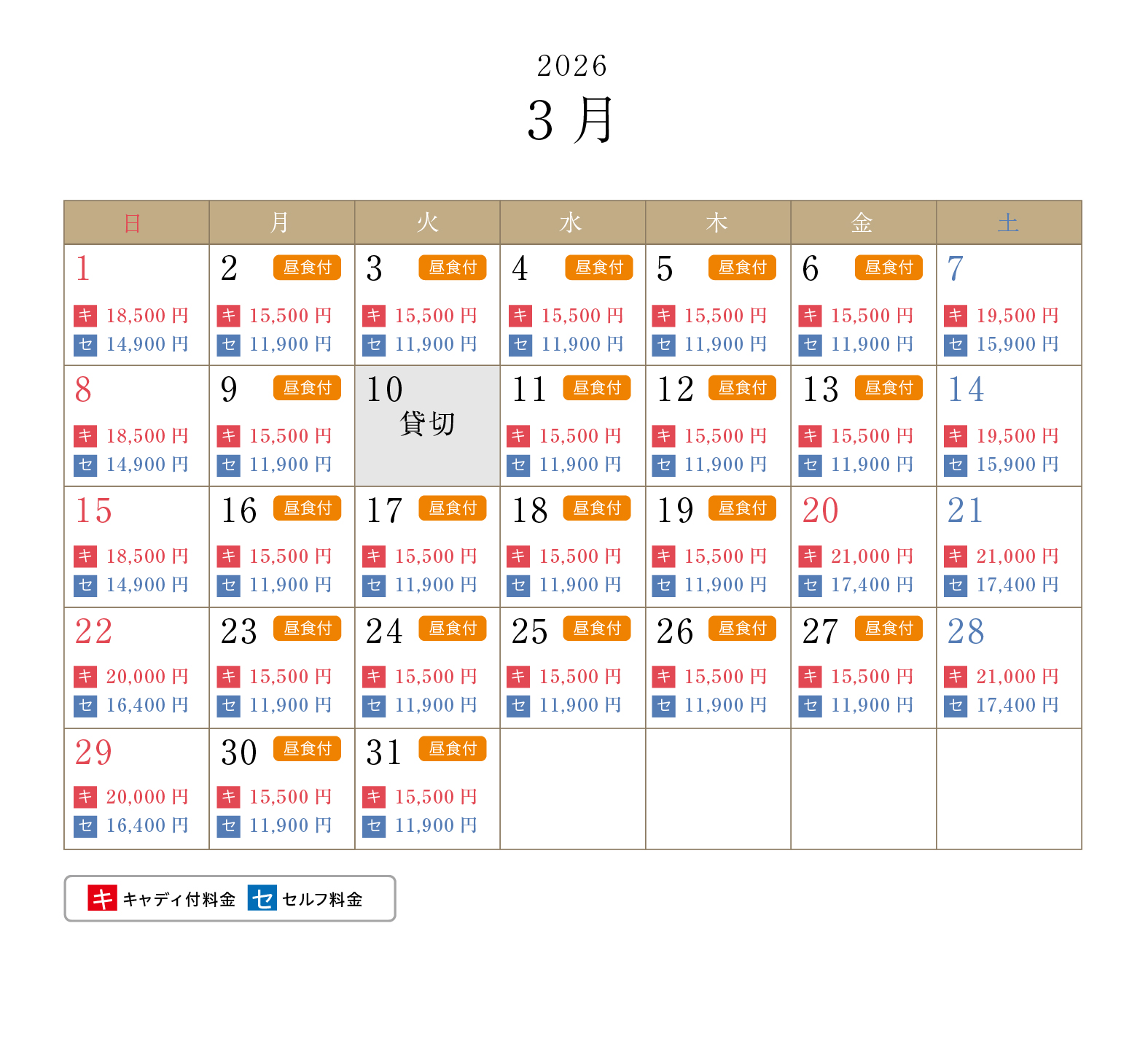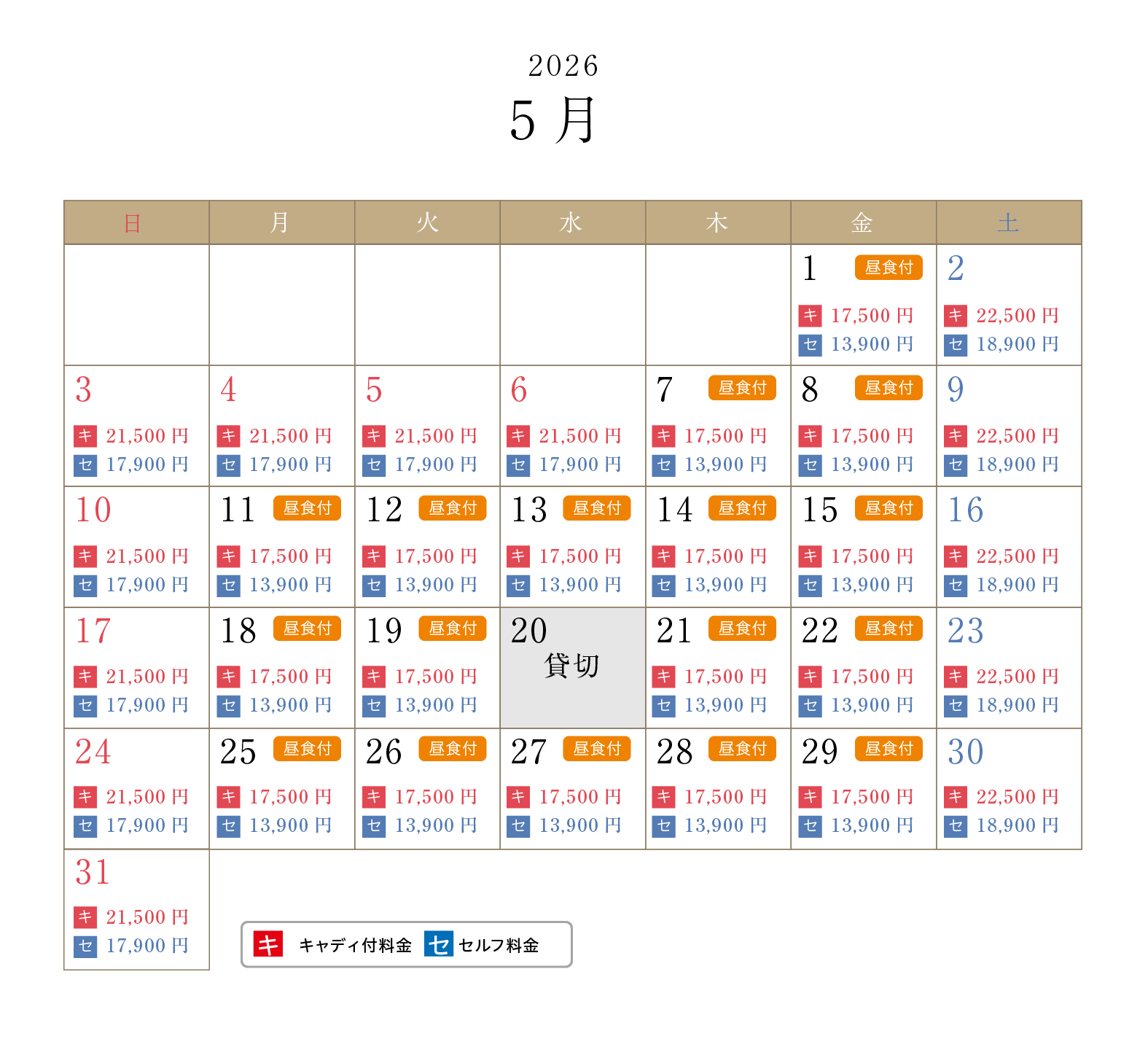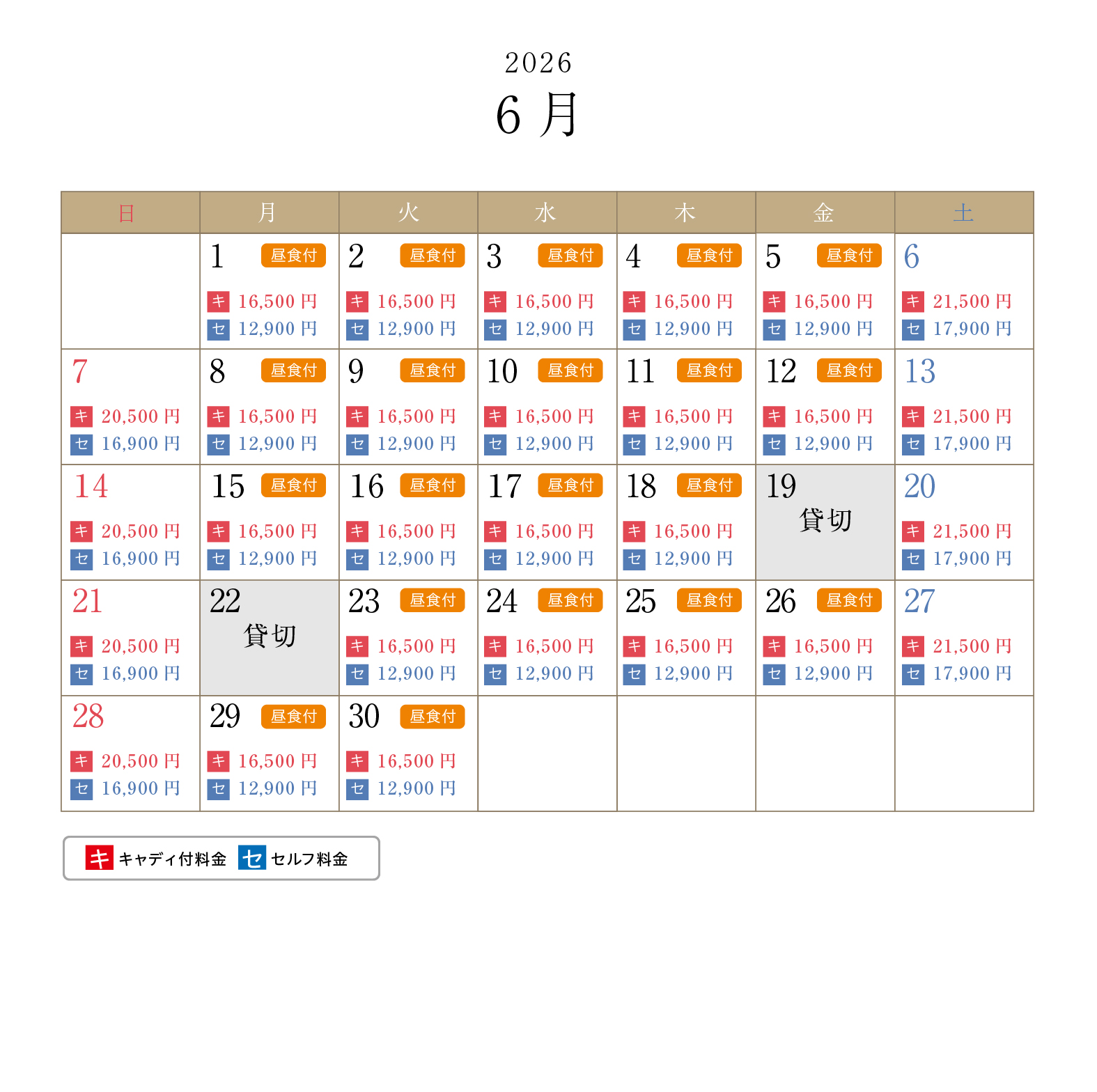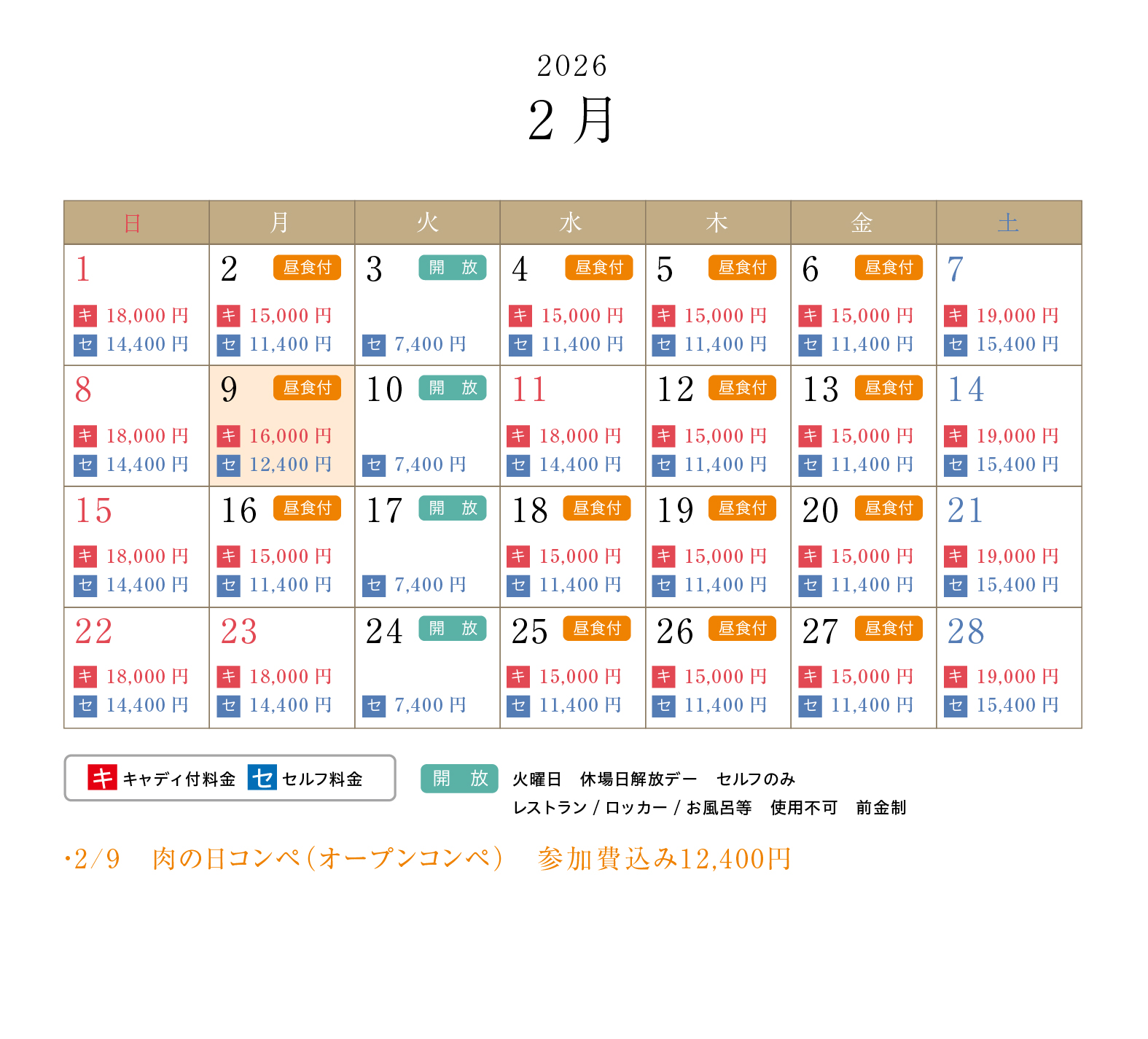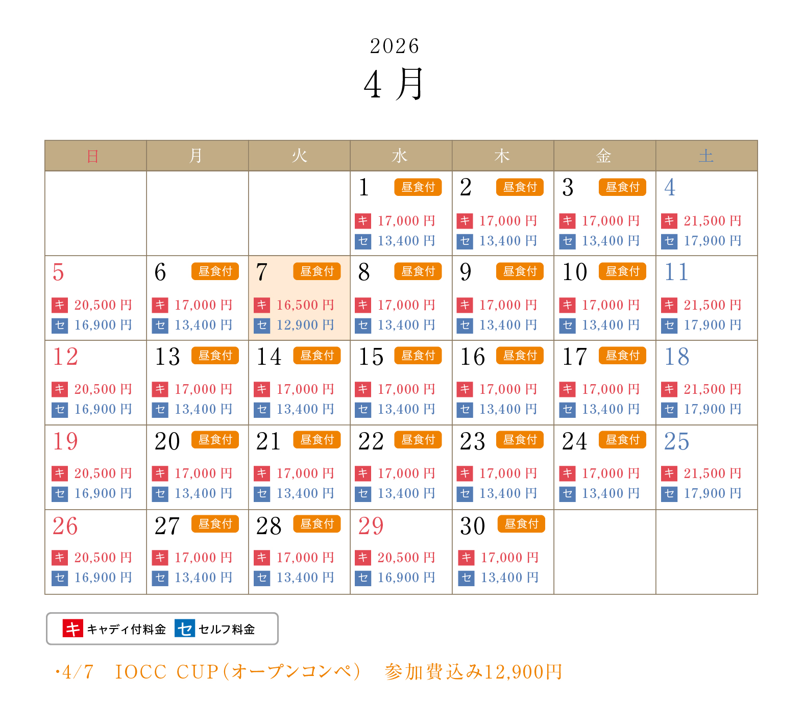 ・上段がキャディ付、下段がセルフプレーの料金となります(1R、乗用カート、諸税込)