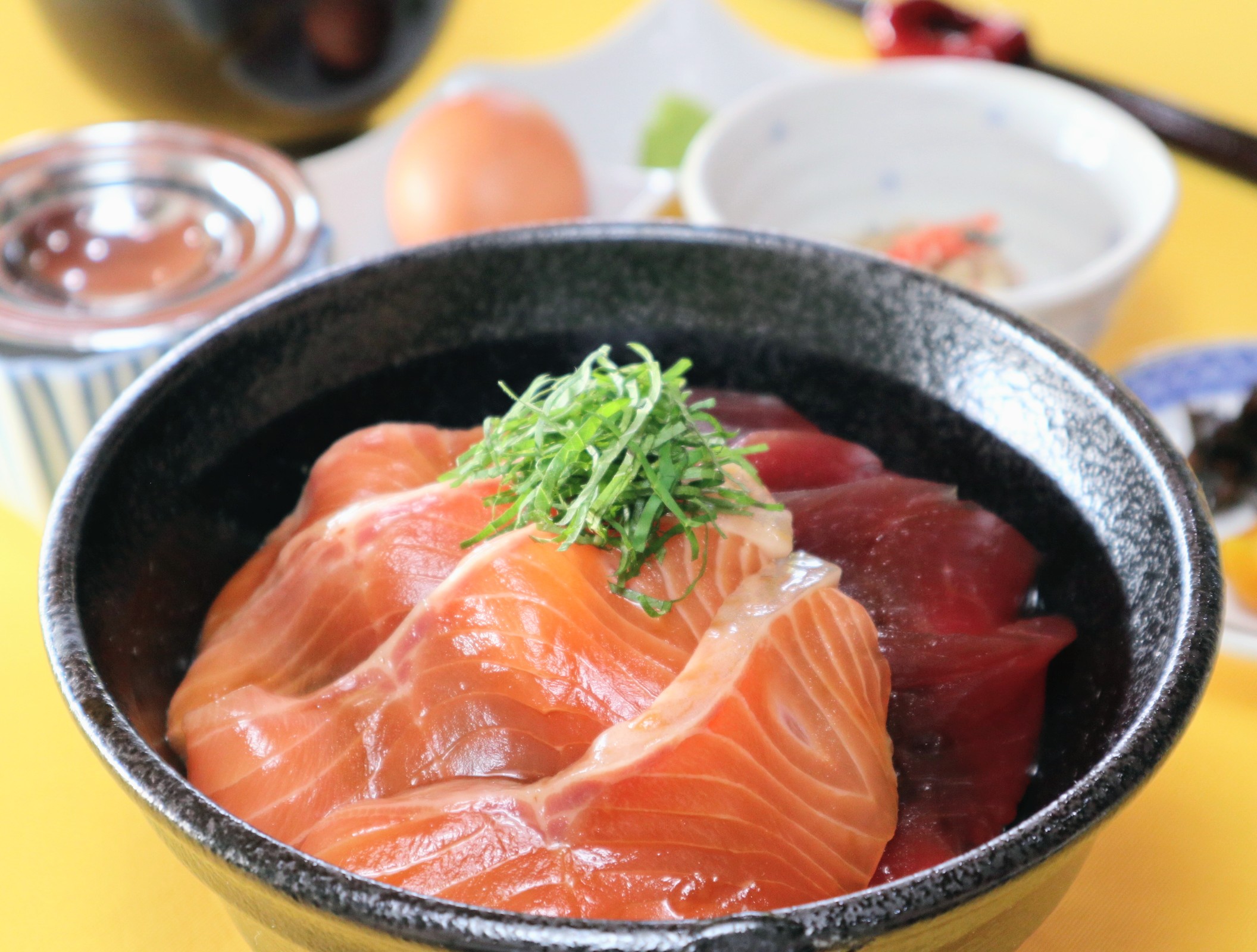 サーモンとまぐろの漬け丼 若鶏の卵付き